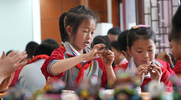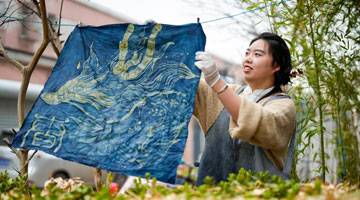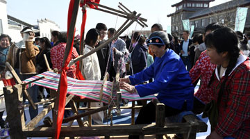 4月4日,水落坡镇乡村社火队队员在演绎鲁北乡村的老粗布织布场景。