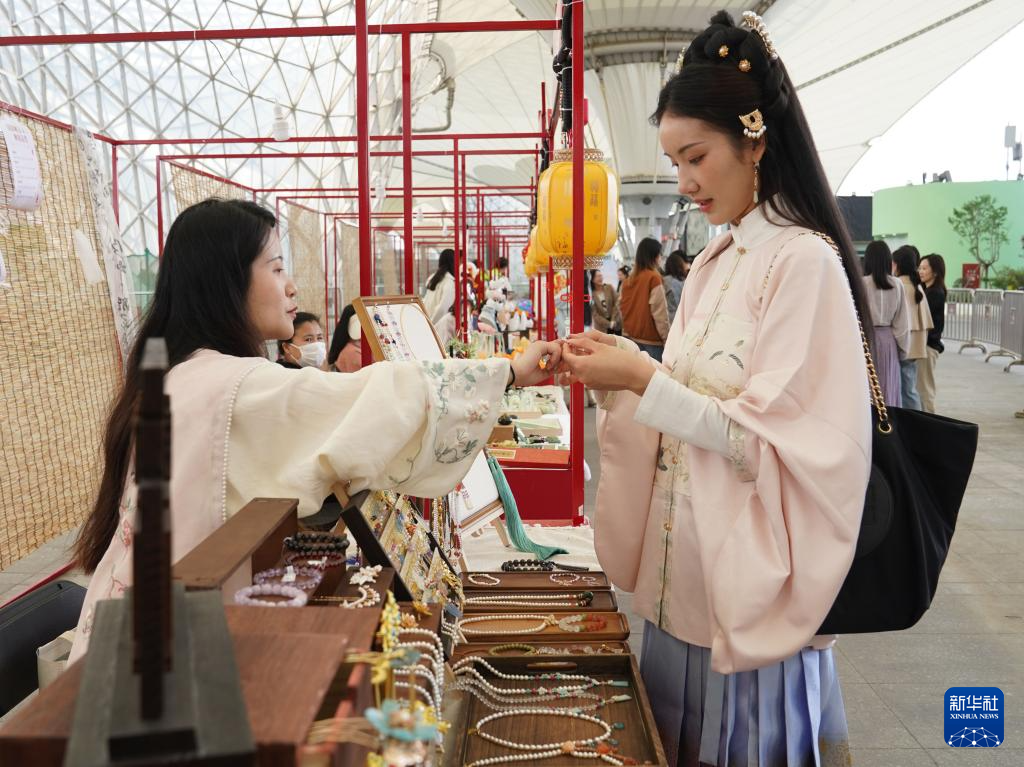4月11日,华服爱好者在国风市集上挑选饰品。