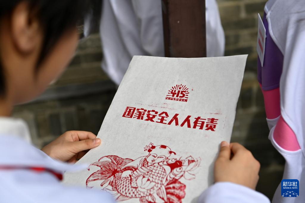4月15日,小学生在国家安全年画娃娃艺术展上自己动手印刷了一张年画。