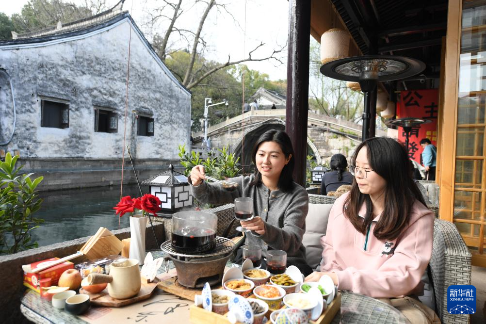 3月13日,人们在仓桥直街的一家店铺围着炉火消费、休闲。