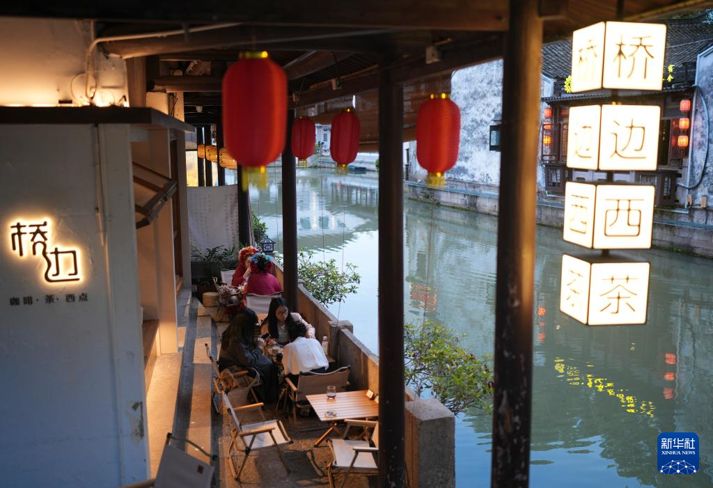 4月24日,游客在仓桥直街一处临水的店铺休憩。