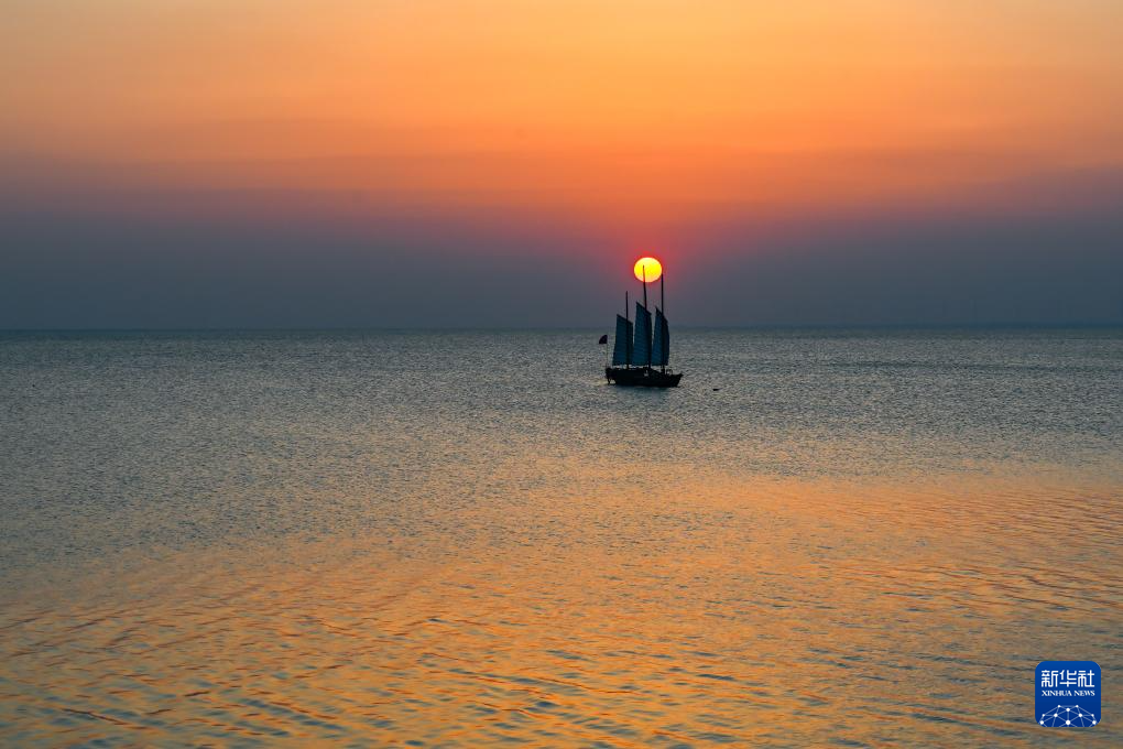 位于扬州高邮市的高邮湖日落景观(4月26日摄)。