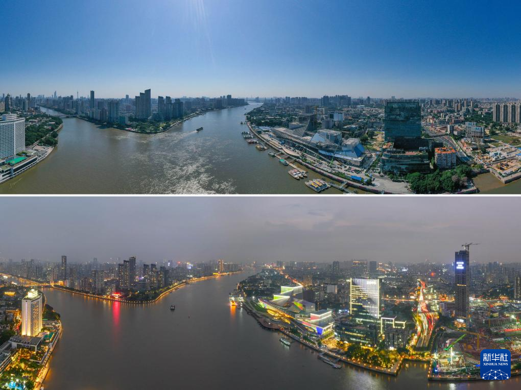 拼版照片:上图为主体施工阶段的白鹅潭大湾区艺术中心(新华社发,2021年12月1日摄);下图为即将竣工的白鹅潭大湾区艺术中心(新华社记者刘大伟2023年11月25日摄)。