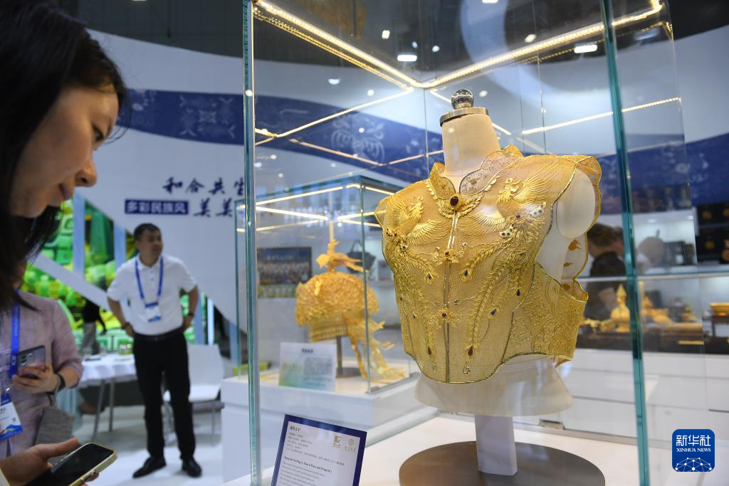 5月23日,观众在第二十届文博会上观看展出的龙凤霞帔金衣。