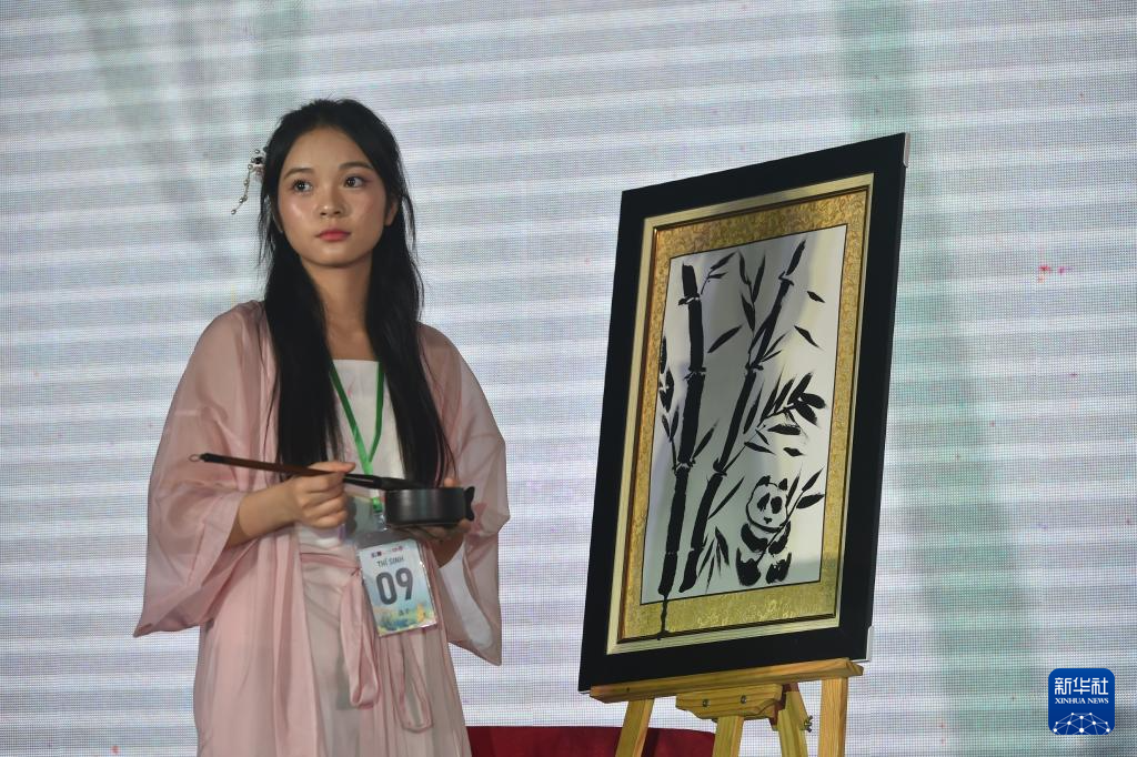 5月25日,在越南河内举行的第23届“汉语桥”世界大学生中文比赛越南北部及中部赛区决赛上,来自河内师范大学的韦氏如琼展示水墨画。
