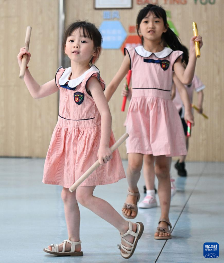 5月29日,在汕头市贵屿镇北林保婴幼儿园,庄恩琪(前左)在练习跳英歌舞。