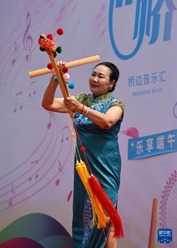 6月6日,非遗传承人在台上表演撒拉姬技艺。当日,天津市红桥区在三岔河口亲水平台举办“乐享端午”演出活动。