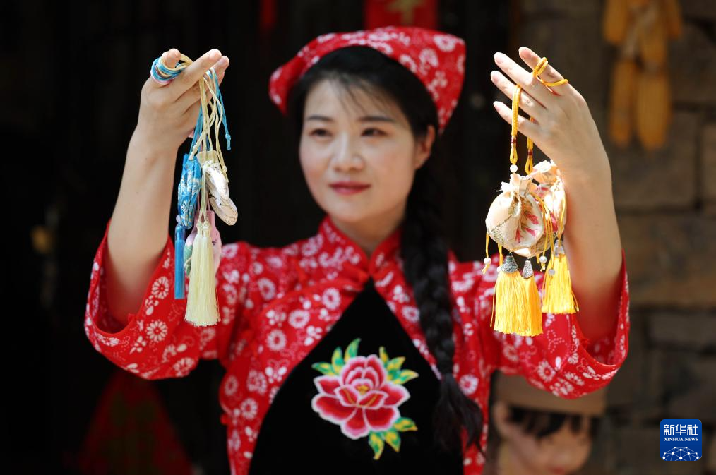 6月6日,在山东省临沂市沂南县铜井镇竹泉村,手工艺人展示制作好的香囊。