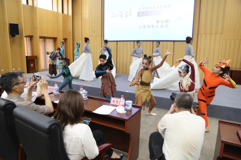 6月20日,《山海经》知识库发布现场,北京融合艺术团的儿童舞蹈演员们现场表演舞台剧《山海神兽之我见》。(国家图书馆供图)