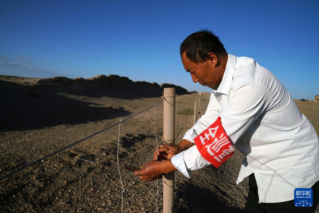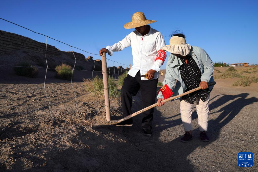7月16日,张吉全和闻春瑜夫妇沿着汉长城巡护时加固防护栏。