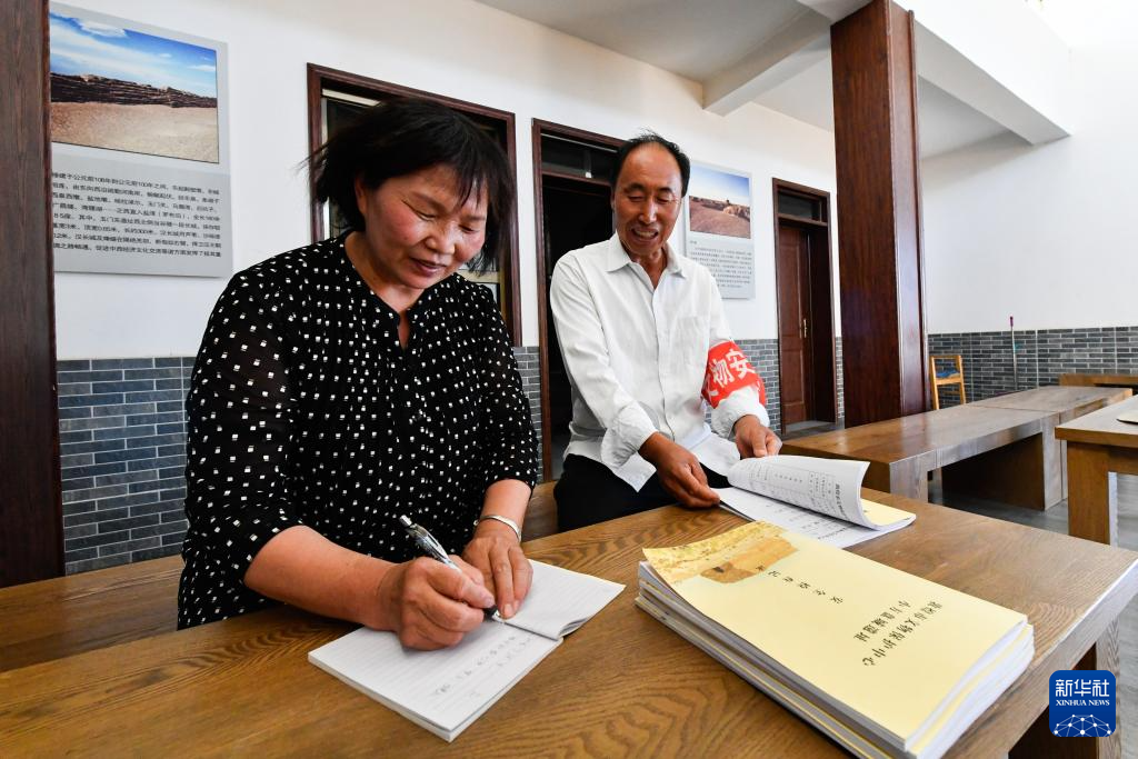 7月16日,张吉全和闻春瑜在汉长城文物保护管理用房内写巡护日记。