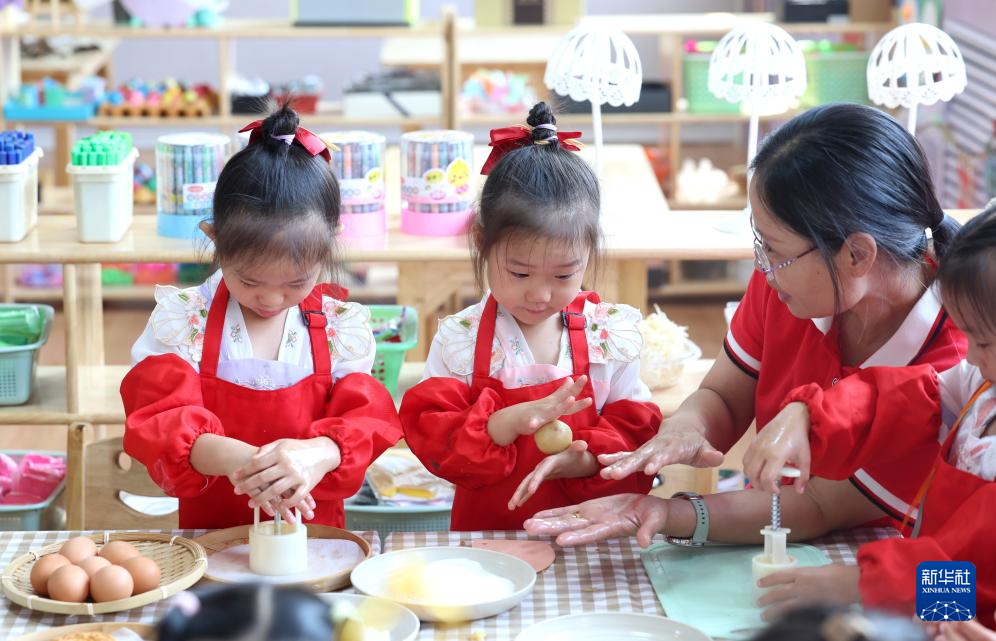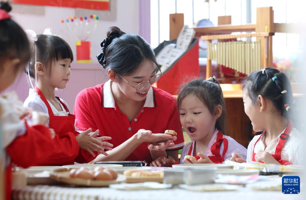 9月4日,在河北省石家庄市藁城区通安幼儿园,小朋友在老师的指导下学做手工月饼。