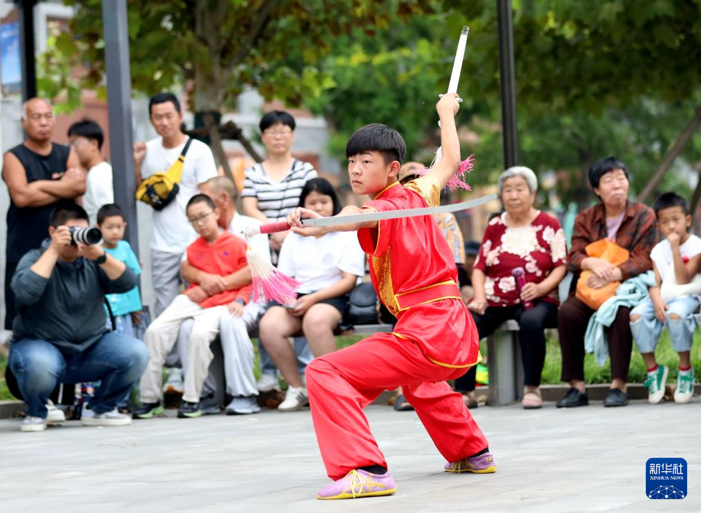 9月8日,一名武术爱好者在南川楼文化街区表演弹腿。