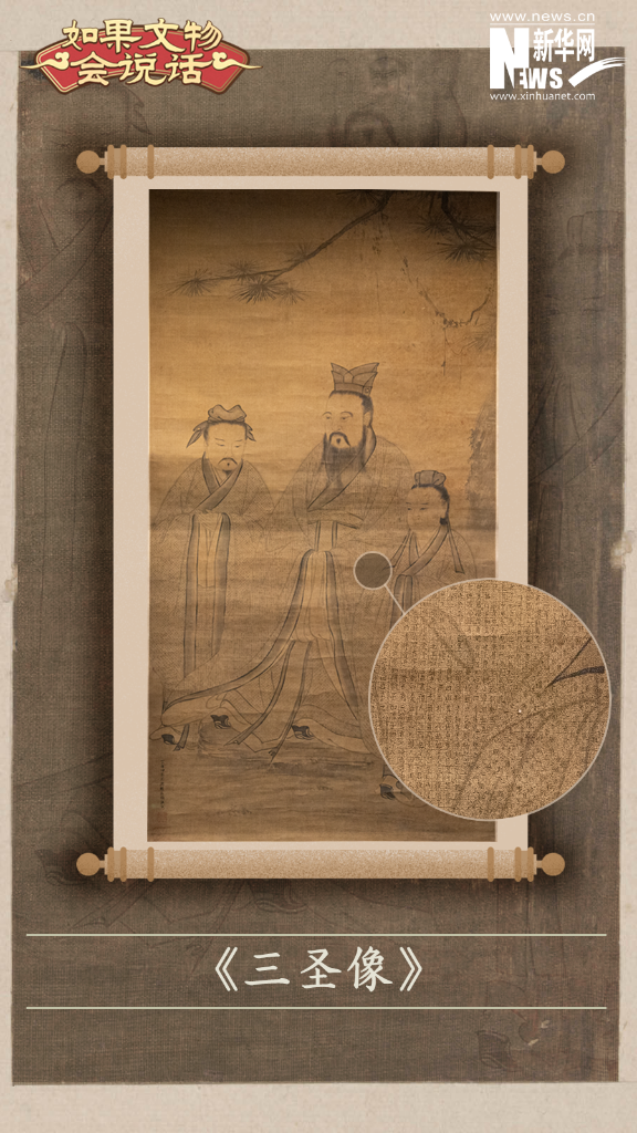 这幅画用人物大小表明身份地位,画上居中者为“至圣”孔子,他身形高大,须眉飘飘,面容庄肃。右侧拢袖而立者,是孔门七十二贤之首——“复圣”颜回,颜回十三岁拜孔子为师,是孔子最得意的门生。左侧插手示敬者,是孔子学说主要继承人——“宗圣”曾参,曾参上承孔子之道,下启思孟学派,在儒家文化的传承中起到重要作用。三人身后,一株古松苍茂劲挺,如华盖般覆于三圣上方,正是“岁寒,然后知松柏之后凋也”的隐喻。松柏寓意着坚贞不渝的志节,具有深刻的教化意义。该图最为奇绝的是,作者将《论语》用细密小楷抄录于三圣外衣上,寓教于画,书画呼应,把孔子“立言不朽,垂教无疆”的弘道精神,以及“仁义礼智信”的儒家思想完美地呈现在了画上。
