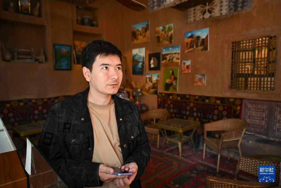 在新疆鄯善县吐峪沟乡吐峪沟村,村民努尔买买提·艾合买提在自家经营的饮品店内休息(10月7日摄)。他家房屋完成维修加固后,便投资开设了饮品店,同时布置了几间房子供游客参观。