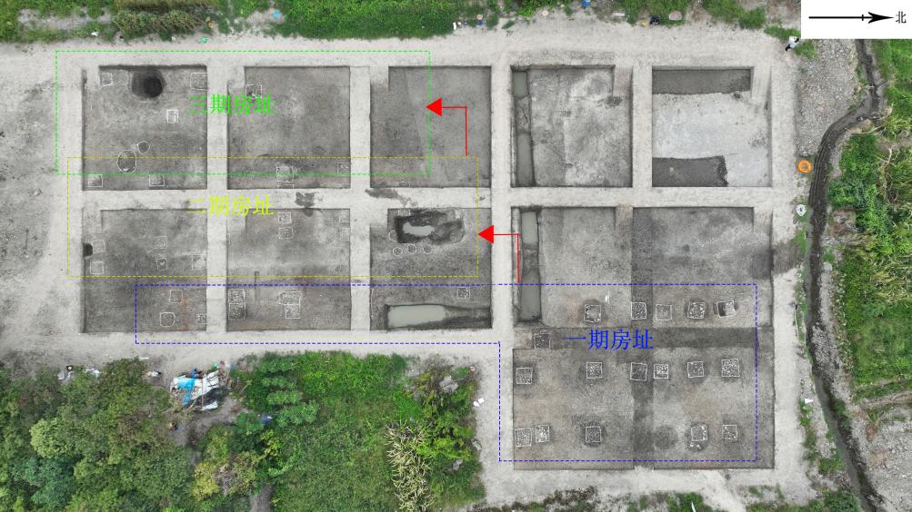 此次发掘共发现五座房址,从下到上、从早到晚可分为三期。一期为北宋时期,房址共两座,分布在发掘区东部及东北部;二期为南宋至元时期,房址共两座,分布在发掘区中部;三期为明清时期,房址共一座,分布在发掘区西南部。在空间上,全部三期房址存在自东北向西南方向发展变迁的过程。