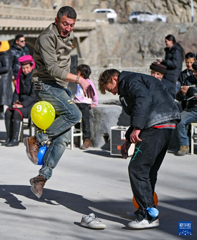 村民在大同乡阿依克日克村的小广场上参与踩气球互动游戏(1月7日摄)。