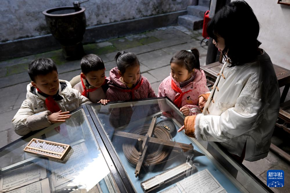 1月9日,在位于安徽省黄山市屯溪区的程大位故居,汪素秋为学生讲解珠算知识。