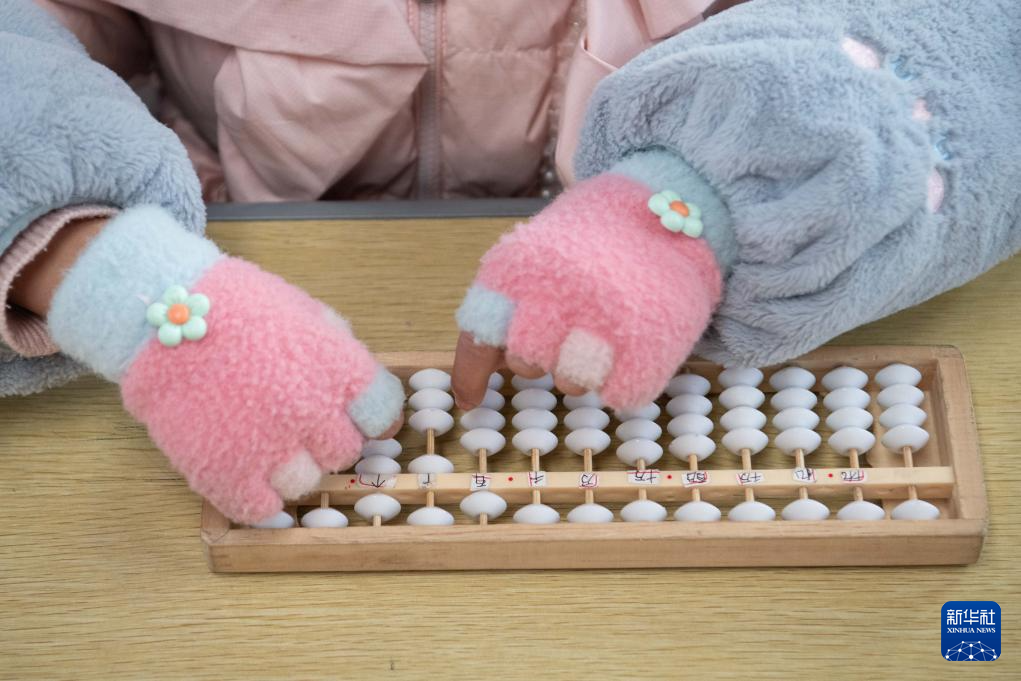 1月9日,安徽省黄山市屯溪大位小学的学生在教室里练习珠算。