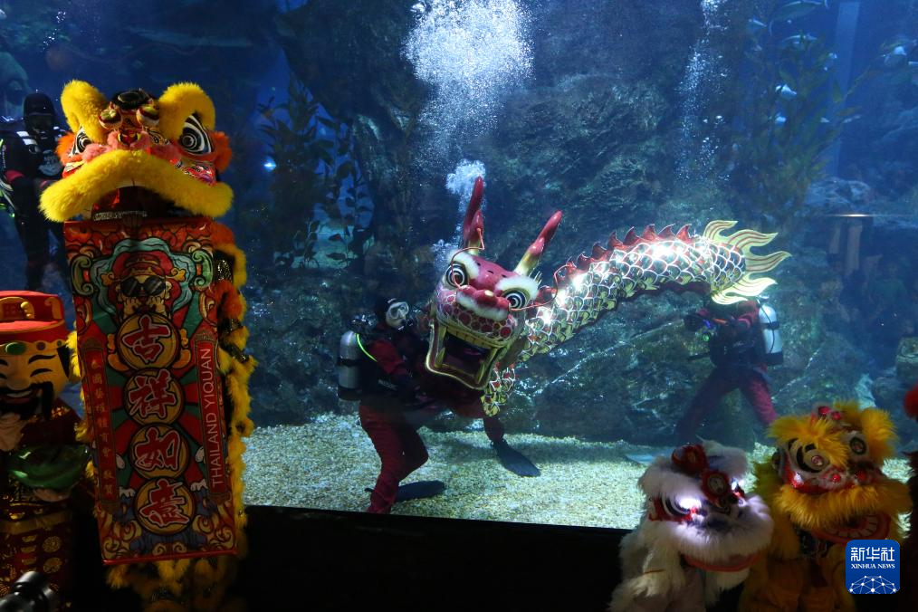 当日,位于泰国曼谷市中心的暹罗海洋世界举办迎新年活动,潜水员在水下表演舞龙,吸引市民前来观赏。