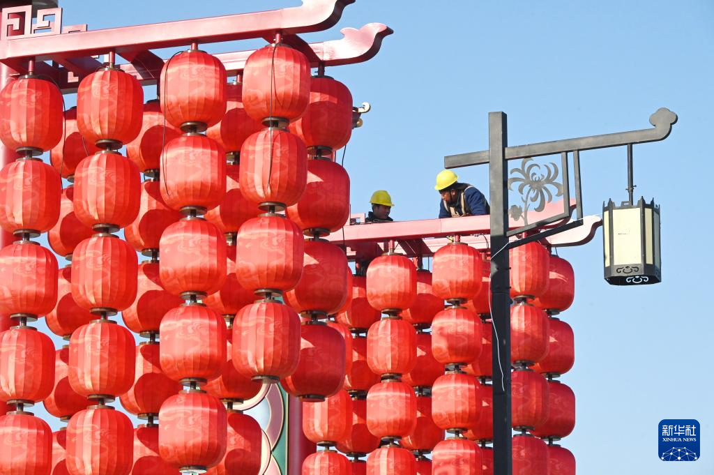 1月18日,山东省临沂市郯城县郯城街道椿枫十里融合农场工作人员在悬挂大红灯笼。
