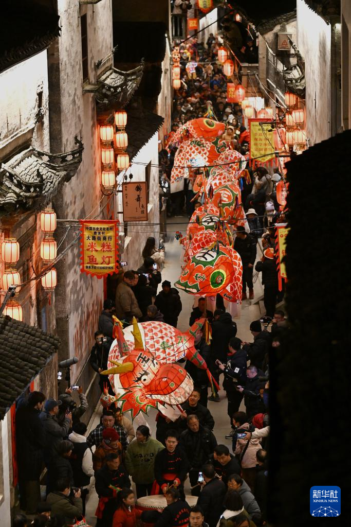 临近春节,安徽省黄山市歙县瞻淇村举行了数场鱼灯巡游活动,众多游客来到这里,感受这座千年古村的独特风景。