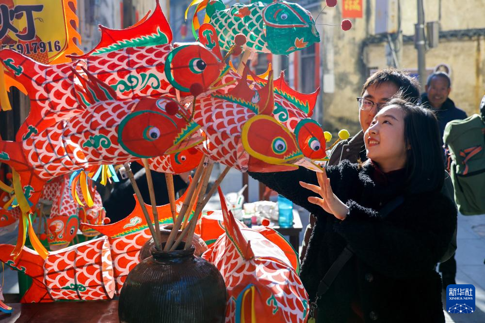 1月18日,在安徽省黄山市歙县北岸镇瞻淇村,游客在选购鱼灯。