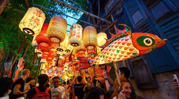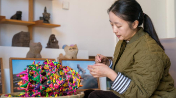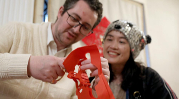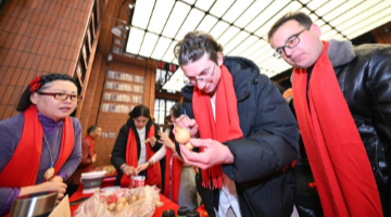 2月3日,北京市朝阳区非物质文化遗产灯彩扎制技艺代表性传承人马海捷(右)在地坛春节文化庙会上展示他制作的灯笼。