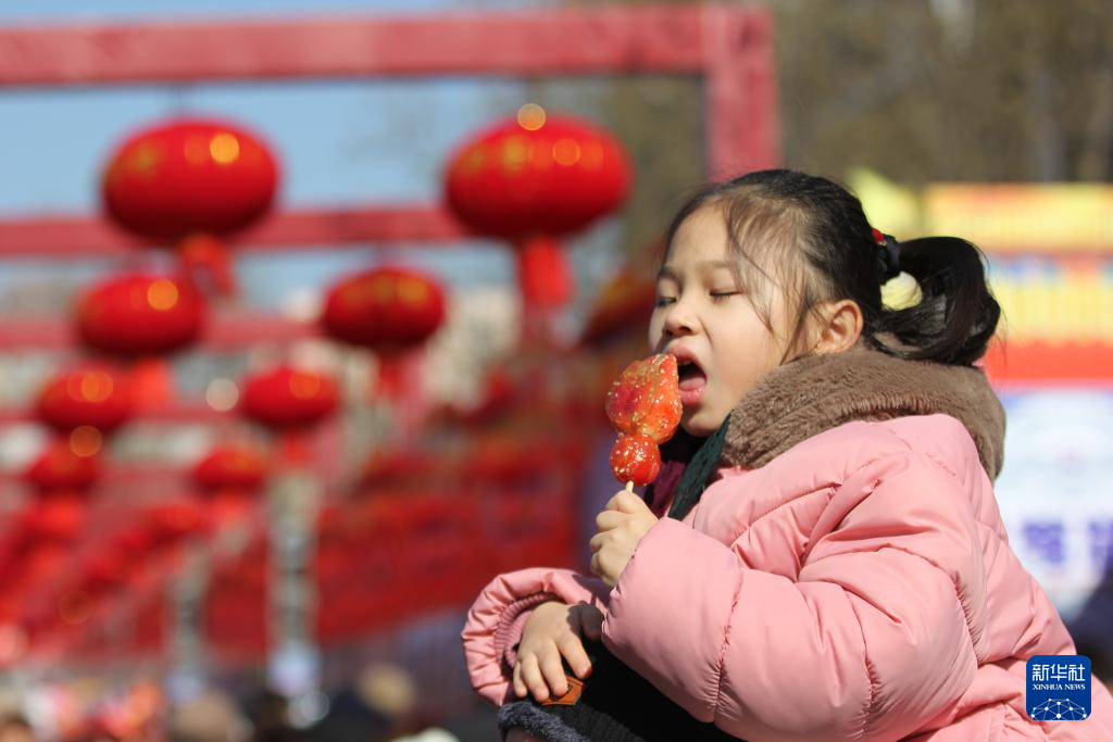 2月9日,一名小朋友在开街仪式上品尝糖球。