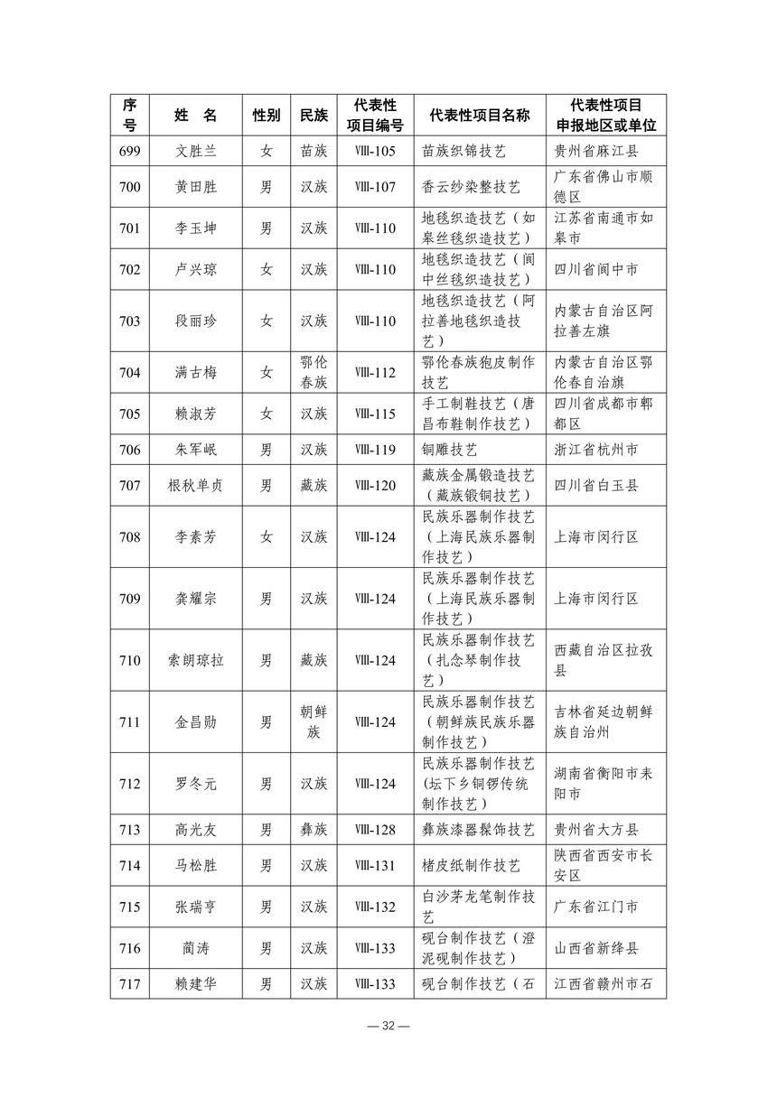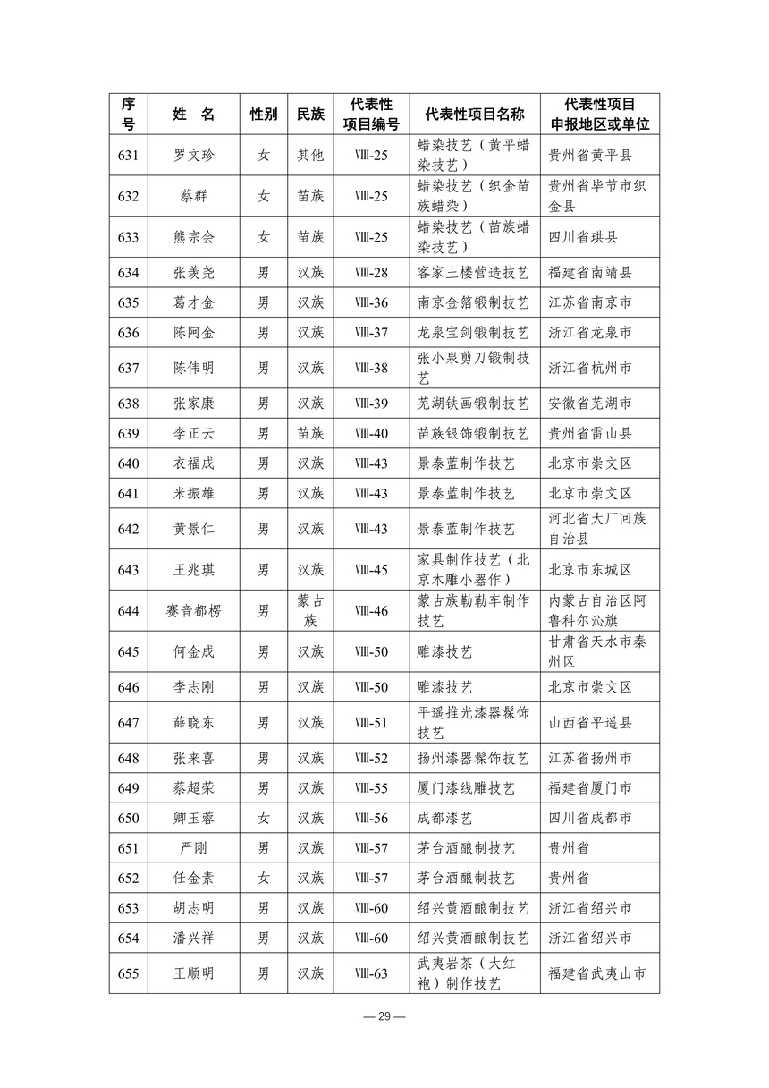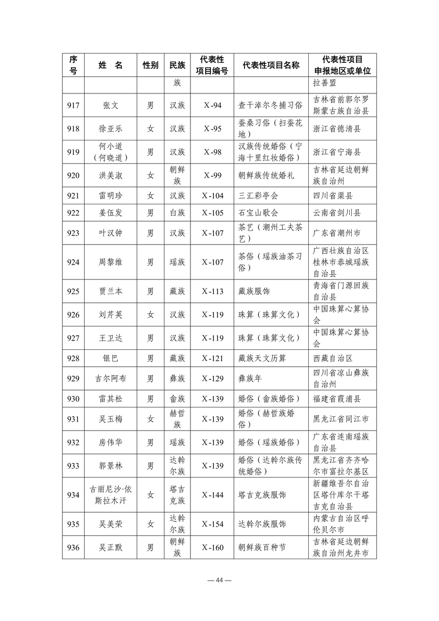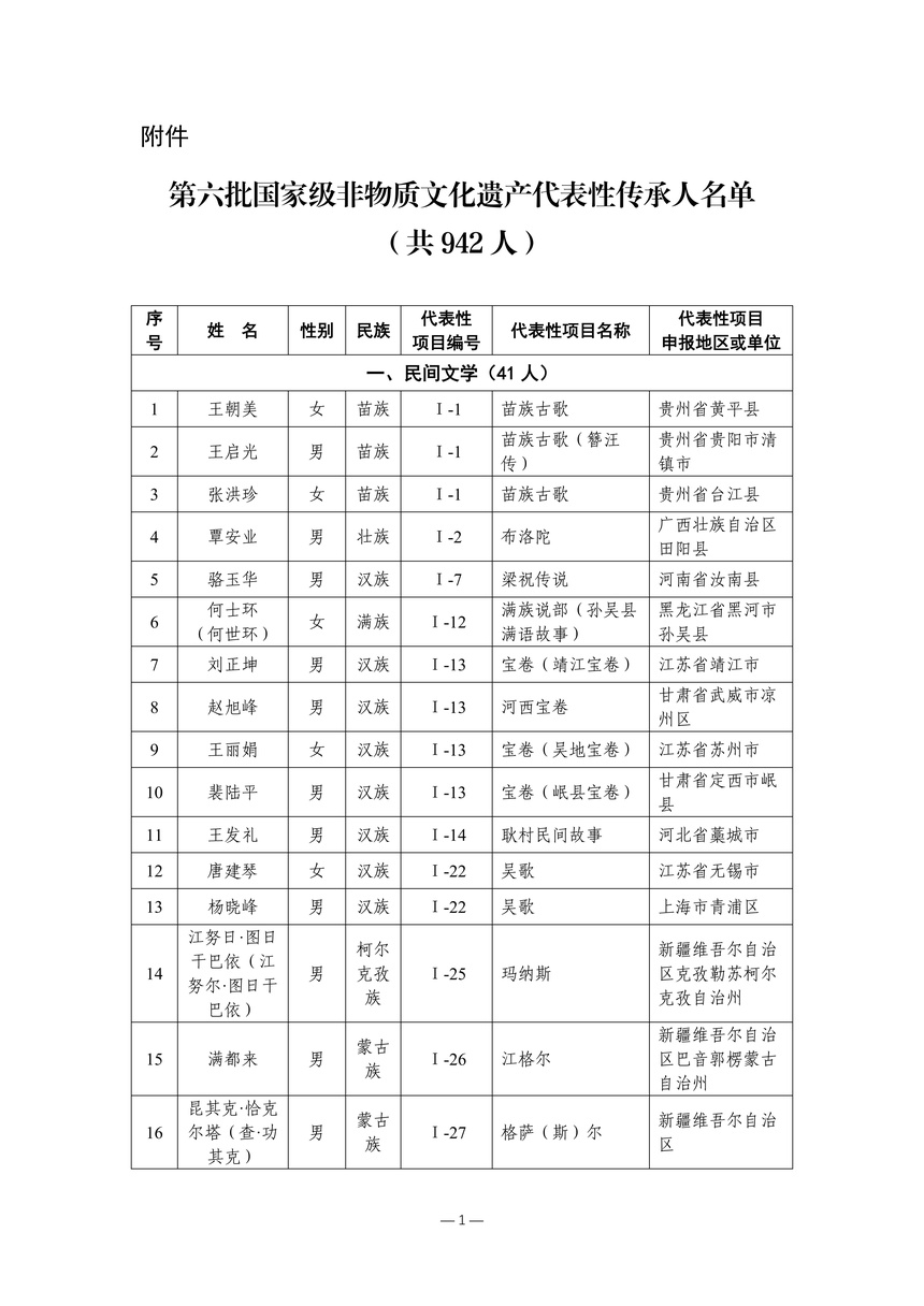 习近平总书记高度重视非物质文化遗产保护传承,强调要积极培养传承人,一代一代接下来、传下去。近年来,各地高度重视非物质文化遗产代表性传承人队伍建设,涌现出一大批德艺双馨、技艺精湛,在非物质文化遗产保护传承中发挥重要作用的典型代表。根据《中华人民共和国非物质文化遗产法》及《国家级非物质文化遗产代表性传承人认定与管理办法》有关规定,为加强非物质文化遗产传承人队伍建设,进一步提升非物质文化遗产系统性保护能力水平,保护和传承好非物质文化遗产,文化和旅游部组织开展第六批国家级非物质文化遗产代表性传承人认定工作。经推荐申报、材料复核、专家初评、社会公示、评审委员会审议等程序,确定了第六批国家级非物质文化遗产代表性传承人名单(942人),现予以公布。