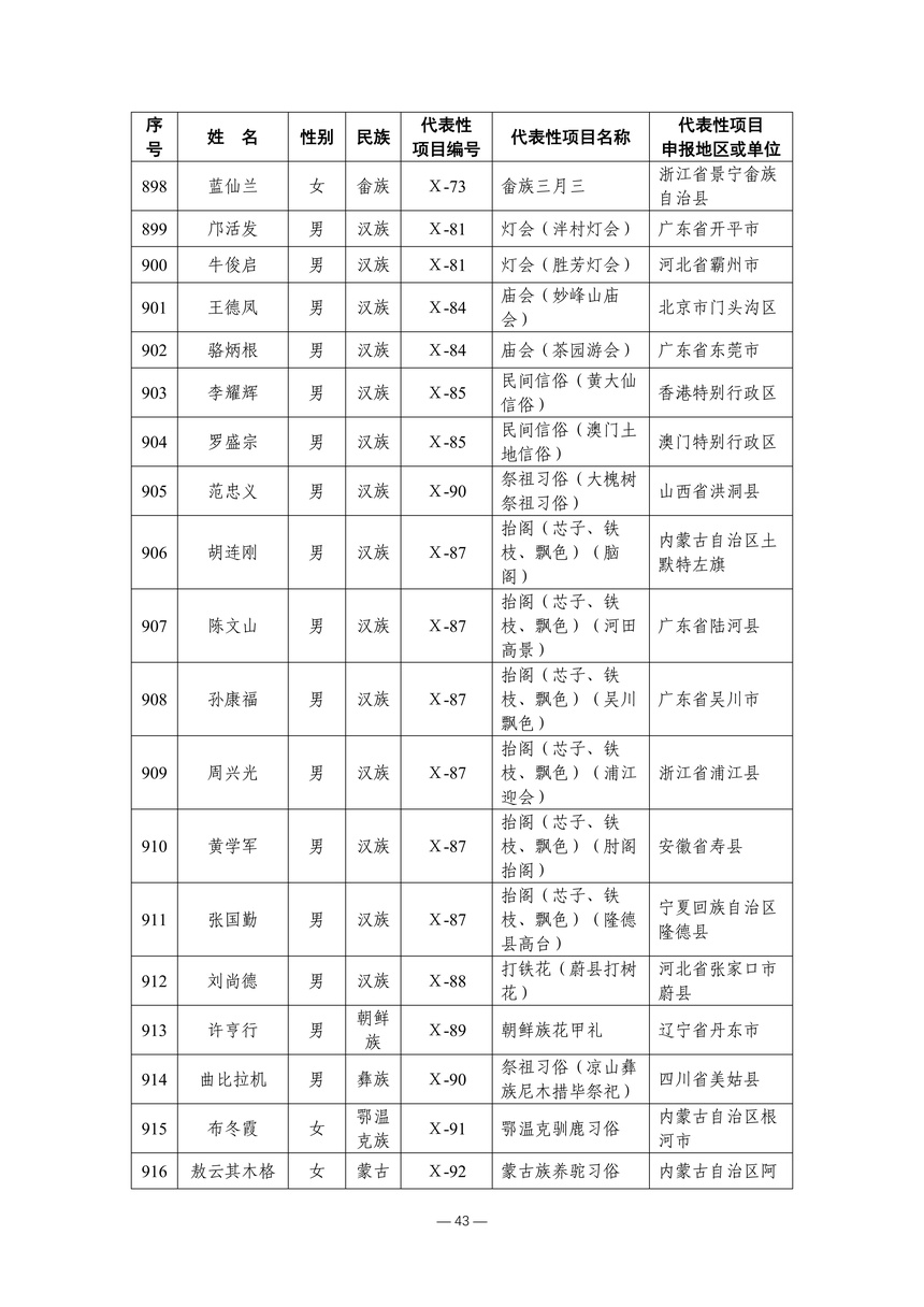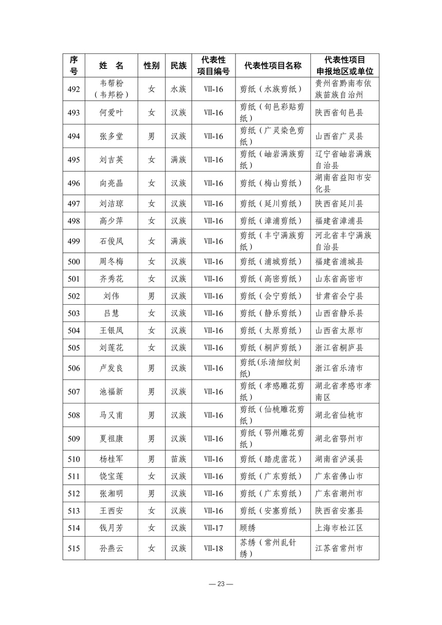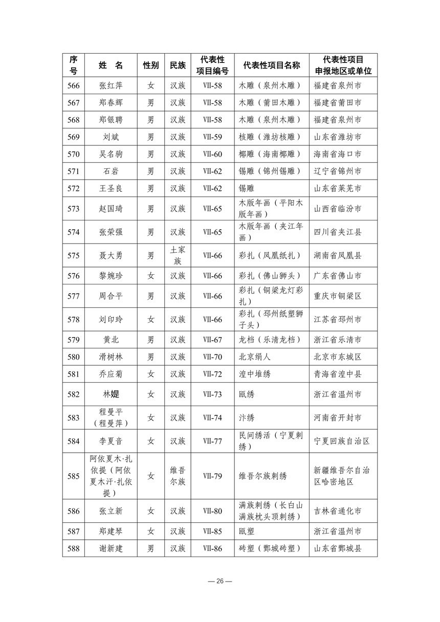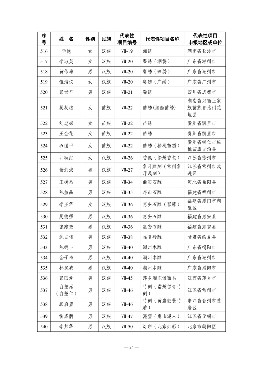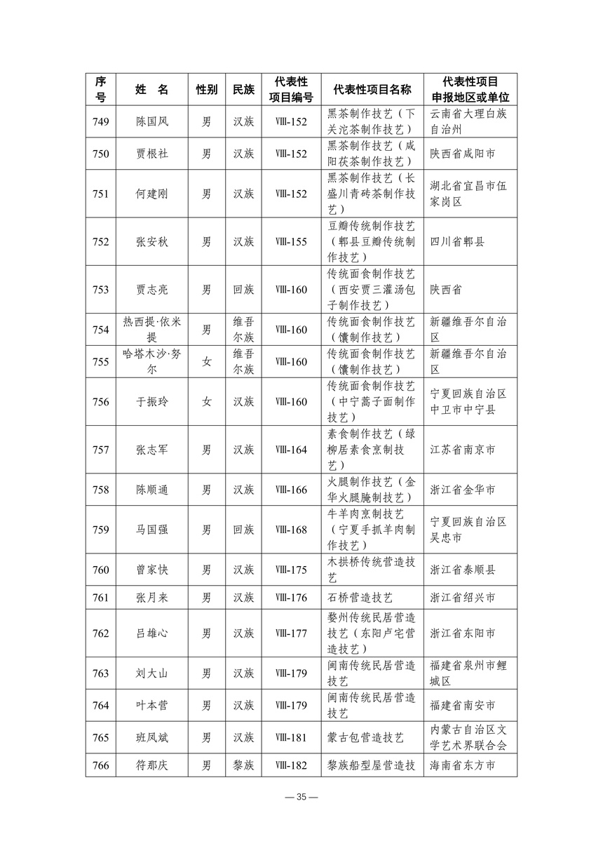 习近平总书记高度重视非物质文化遗产保护传承,强调要积极培养传承人,一代一代接下来、传下去。近年来,各地高度重视非物质文化遗产代表性传承人队伍建设,涌现出一大批德艺双馨、技艺精湛,在非物质文化遗产保护传承中发挥重要作用的典型代表。根据《中华人民共和国非物质文化遗产法》及《国家级非物质文化遗产代表性传承人认定与管理办法》有关规定,为加强非物质文化遗产传承人队伍建设,进一步提升非物质文化遗产系统性保护能力水平,保护和传承好非物质文化遗产,文化和旅游部组织开展第六批国家级非物质文化遗产代表性传承人认定工作。经推荐申报、材料复核、专家初评、社会公示、评审委员会审议等程序,确定了第六批国家级非物质文化遗产代表性传承人名单(942人),现予以公布。