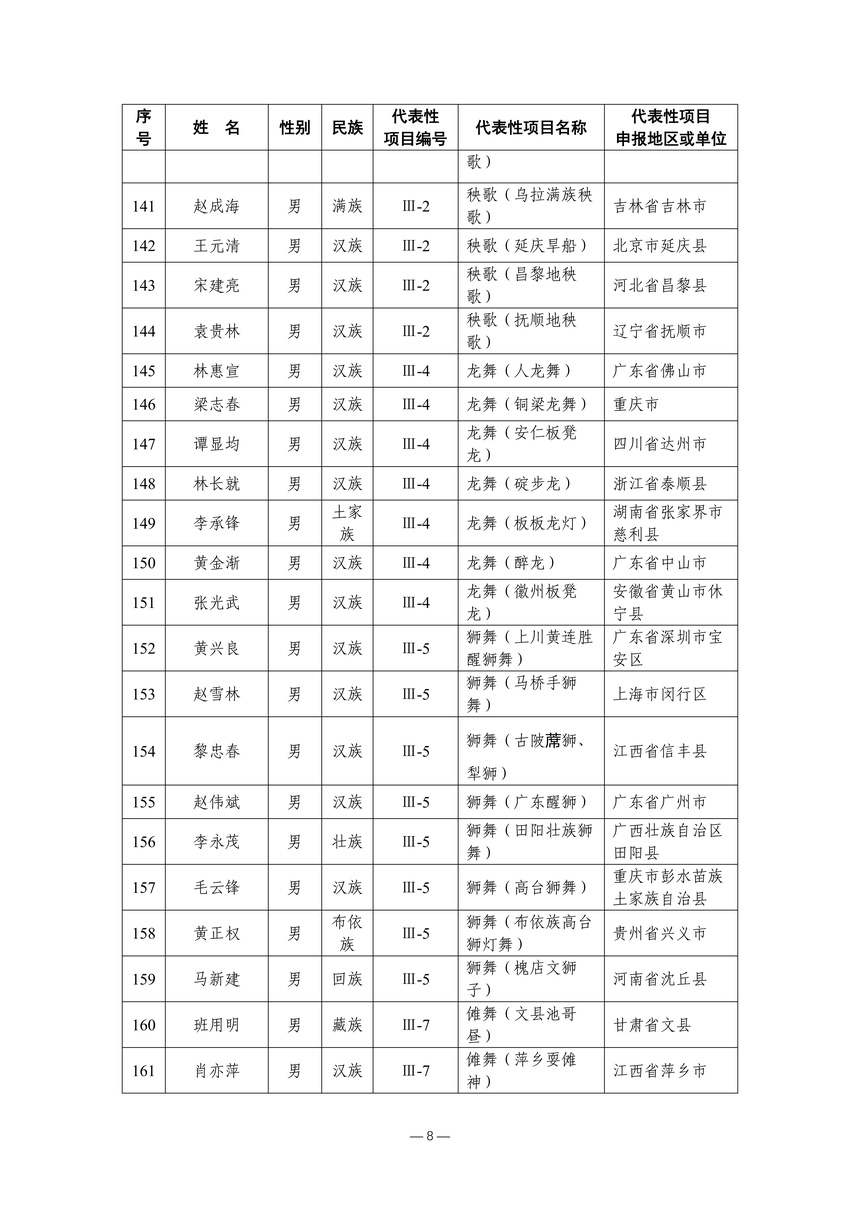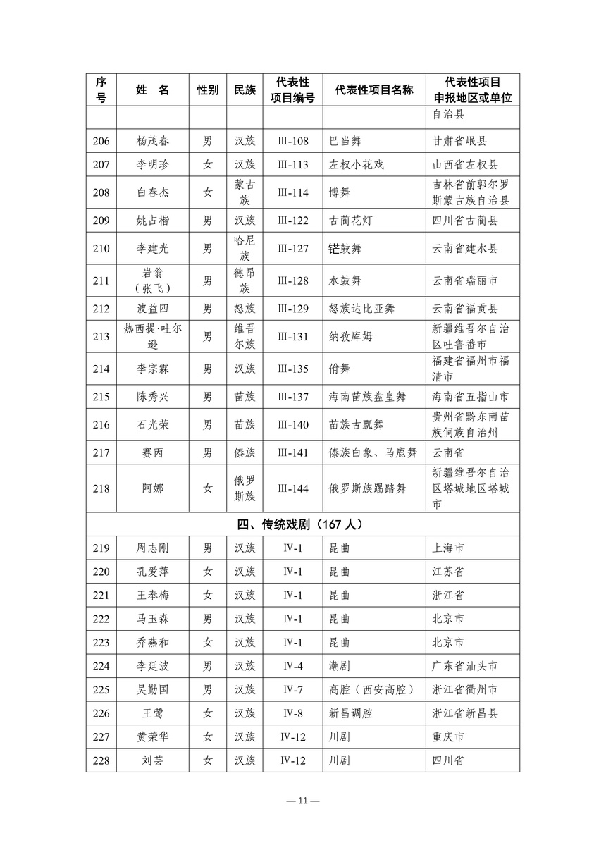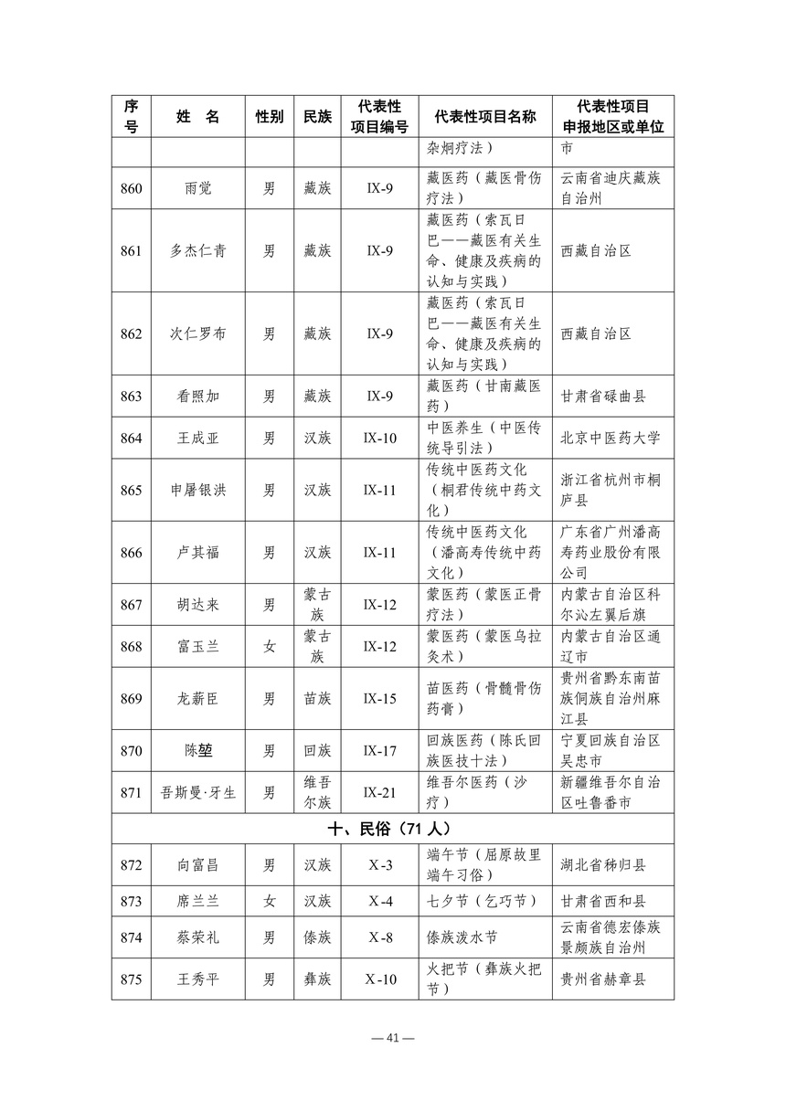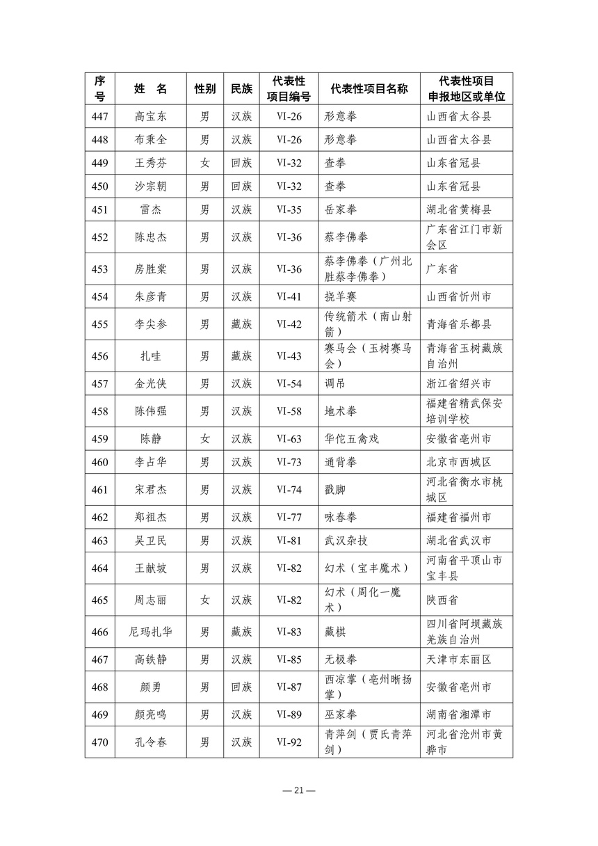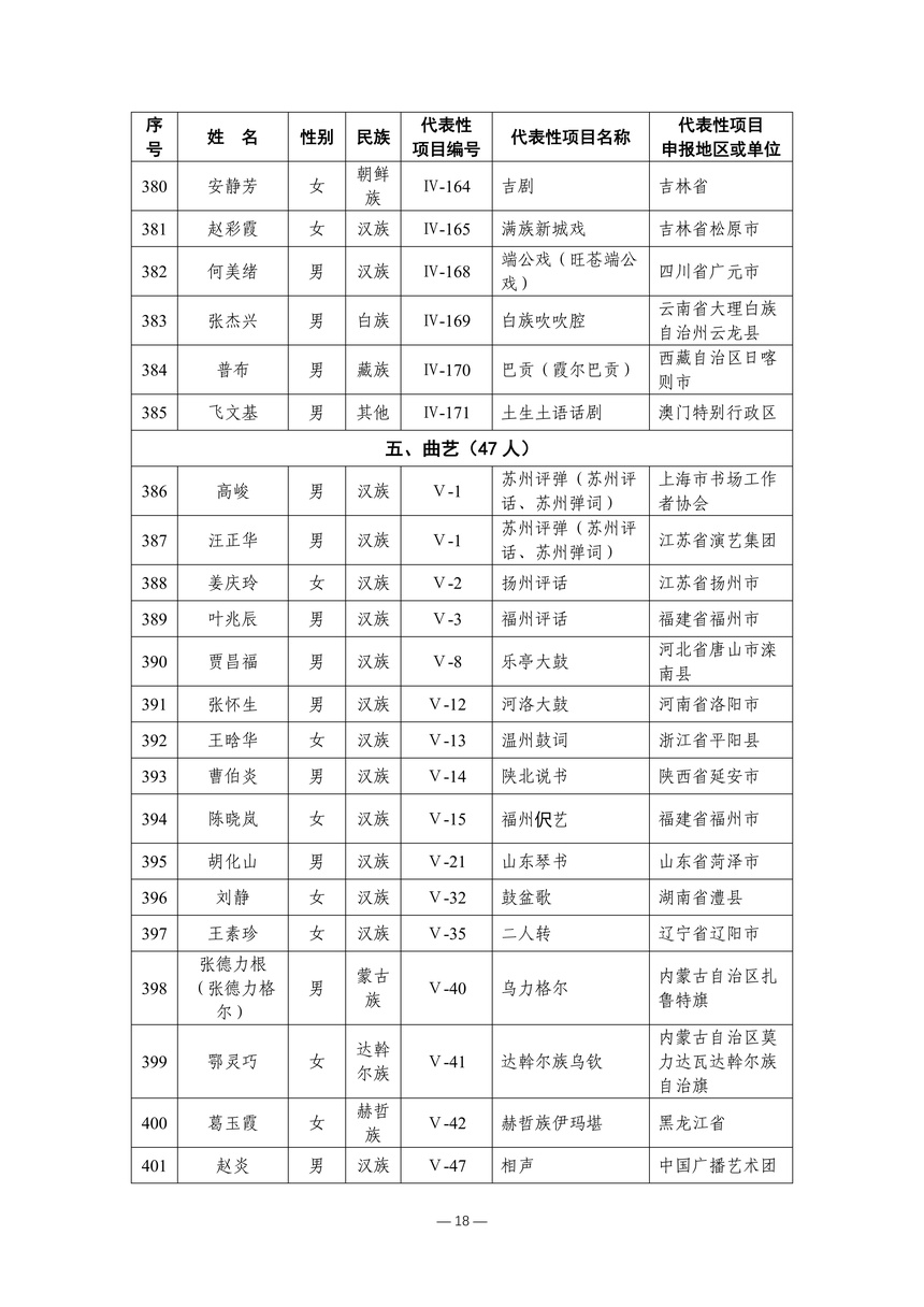 习近平总书记高度重视非物质文化遗产保护传承,强调要积极培养传承人,一代一代接下来、传下去。近年来,各地高度重视非物质文化遗产代表性传承人队伍建设,涌现出一大批德艺双馨、技艺精湛,在非物质文化遗产保护传承中发挥重要作用的典型代表。根据《中华人民共和国非物质文化遗产法》及《国家级非物质文化遗产代表性传承人认定与管理办法》有关规定,为加强非物质文化遗产传承人队伍建设,进一步提升非物质文化遗产系统性保护能力水平,保护和传承好非物质文化遗产,文化和旅游部组织开展第六批国家级非物质文化遗产代表性传承人认定工作。经推荐申报、材料复核、专家初评、社会公示、评审委员会审议等程序,确定了第六批国家级非物质文化遗产代表性传承人名单(942人),现予以公布。