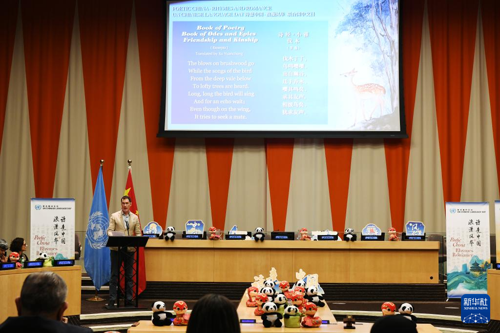 4月15日,在位于纽约的联合国总部,来自联合国全球传播部的美国青年扎克·丹茨在2025年联合国中文日活动上朗诵《周易》片段。