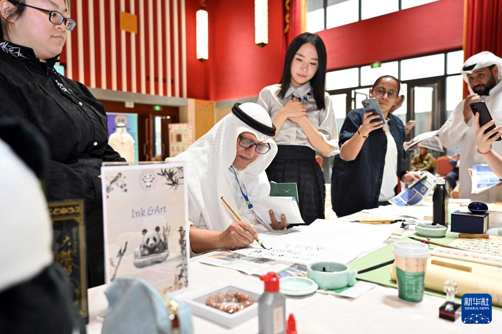 4月20日,参与者在科威特哈瓦利省举行的“国际中文日”暨使馆开放日活动中体验中国书法。