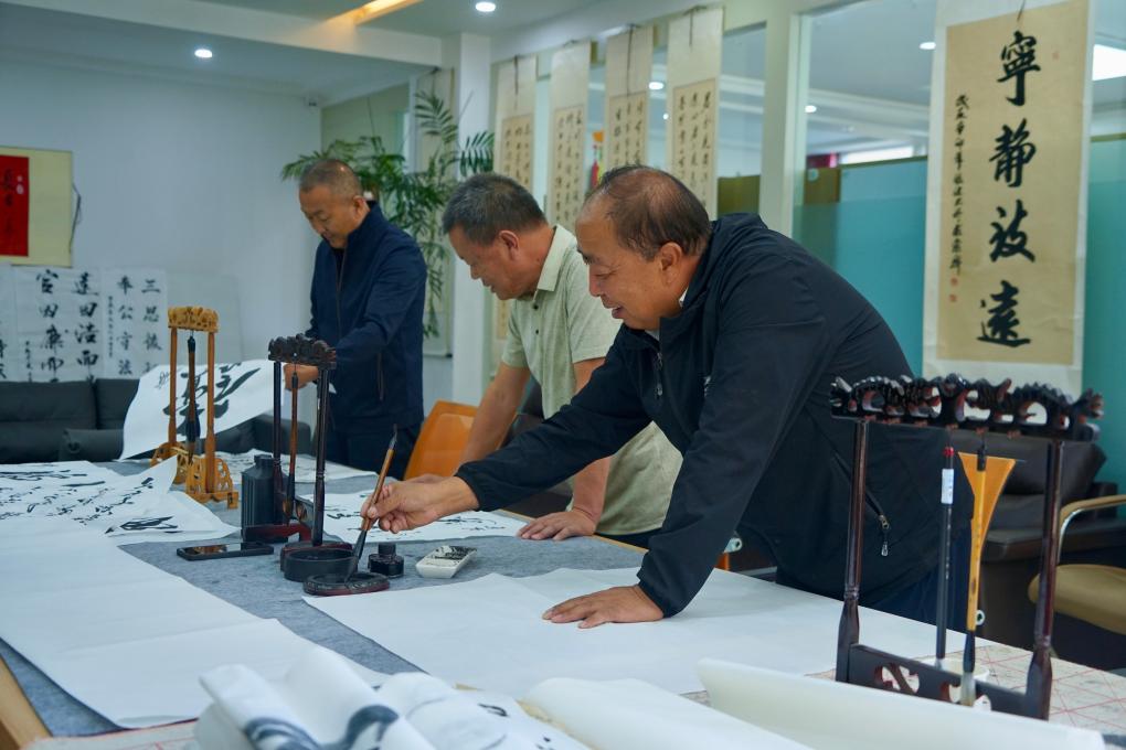 青海省西宁市城北区陶北村农家书屋的书画室,村民在练习书法。新华社记者张子琪 摄