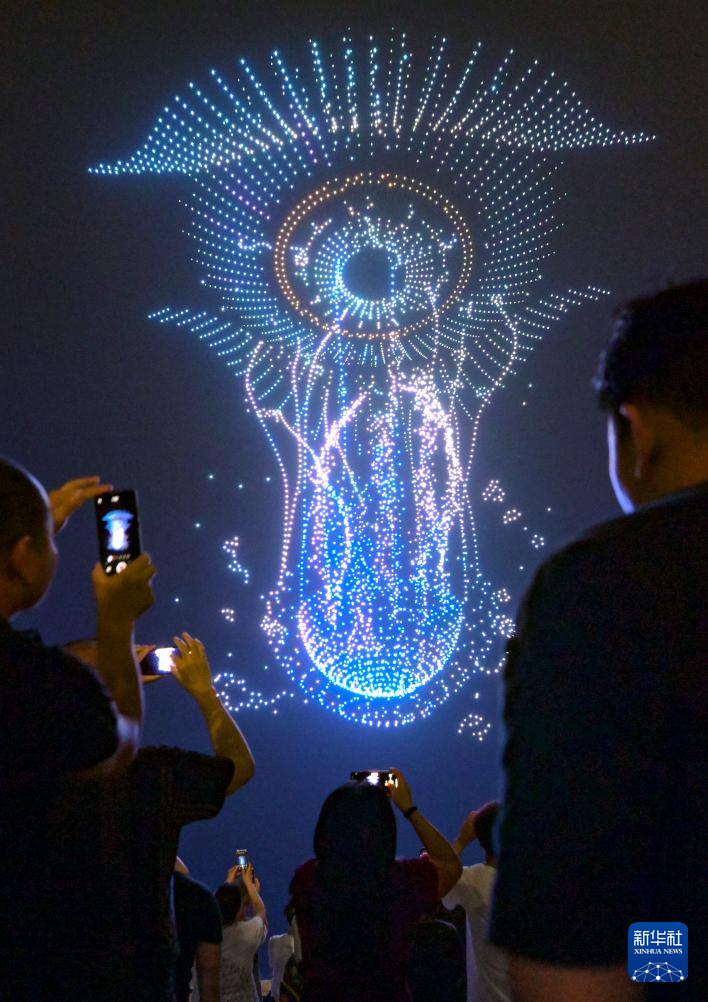 7月9日,观众在河源市万绿湖风景区观看无人机灯光秀表演。