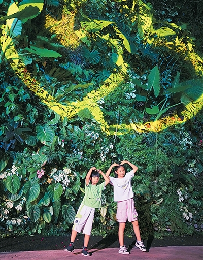 小朋友夜游位于上海世博文化公园的上海温室花园(测试场)。新华社记者 刘颖摄
