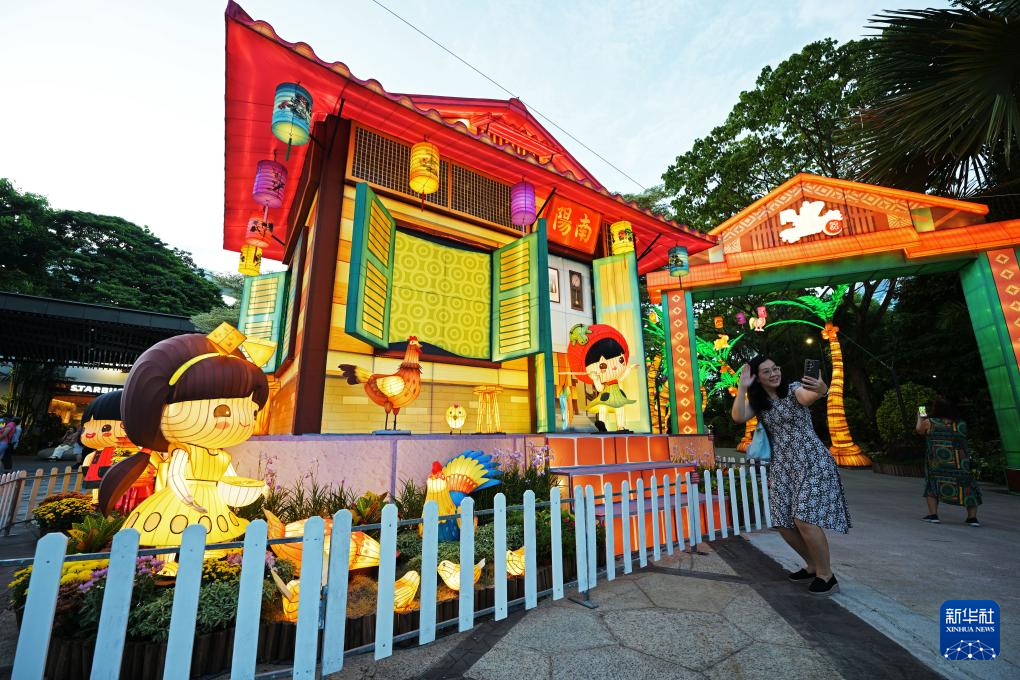 9月22日,游客在新加坡滨海湾花园欣赏中秋节灯饰。