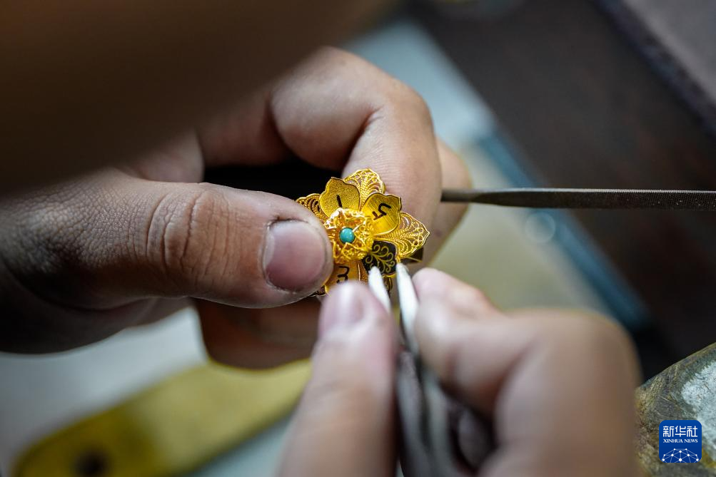 10月25日,在昆明乌铜走银传习馆,匠人在制作乌铜走银首饰。