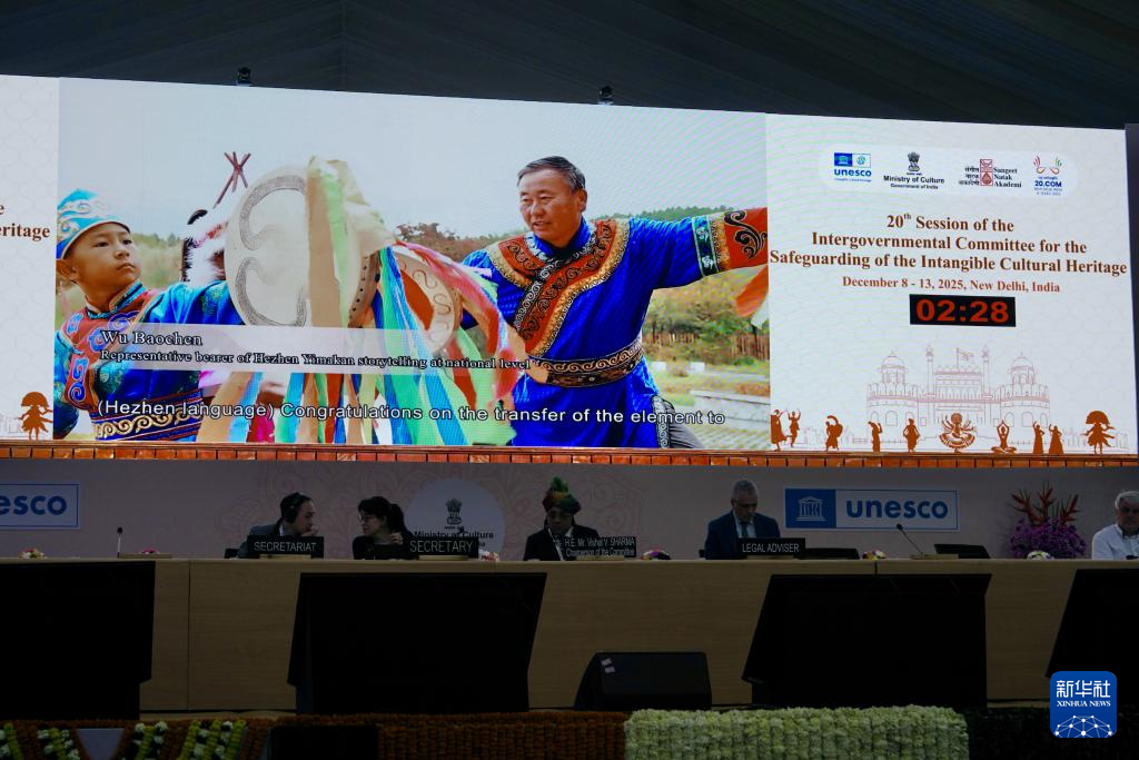 12月11日,在印度新德里举行的联合国教科文组织保护非物质文化遗产政府间委员会第20届常会上,大屏幕上播放中国“赫哲族伊玛堪”保护成果。