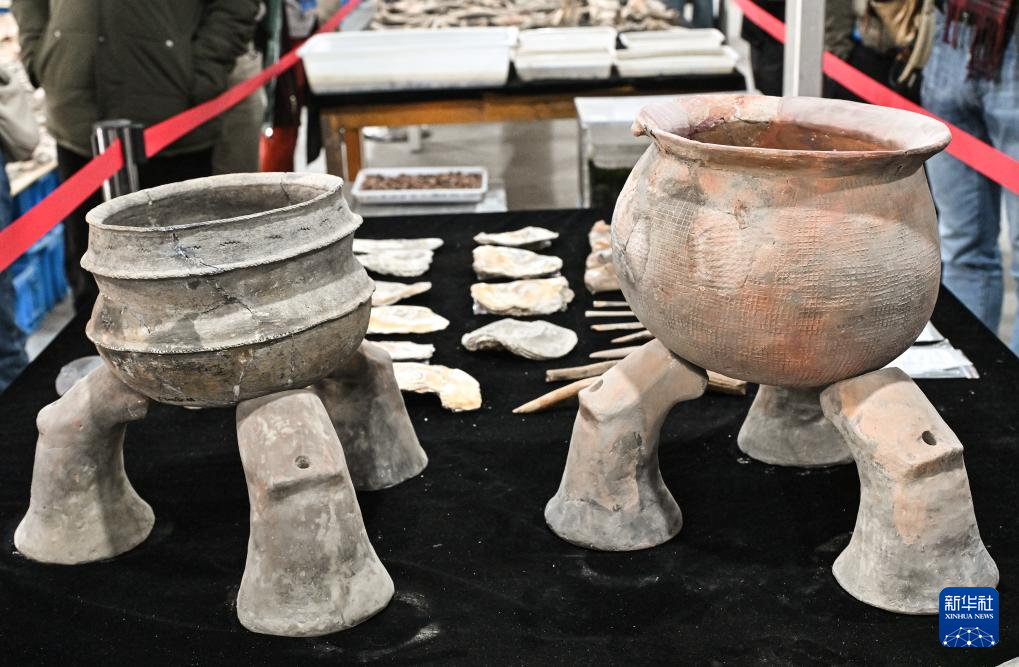 井头山遗址出土的贝器和石器(12月15日摄)。