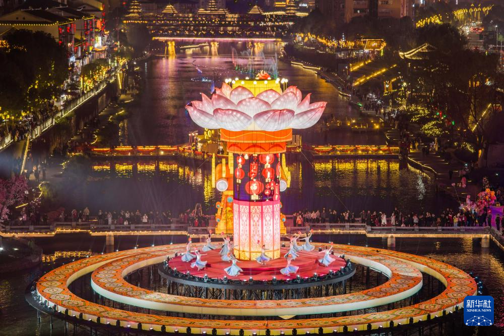 2月11日,市民和游客在四川省泸州市江阳区大梯步文化广场赏灯游玩。