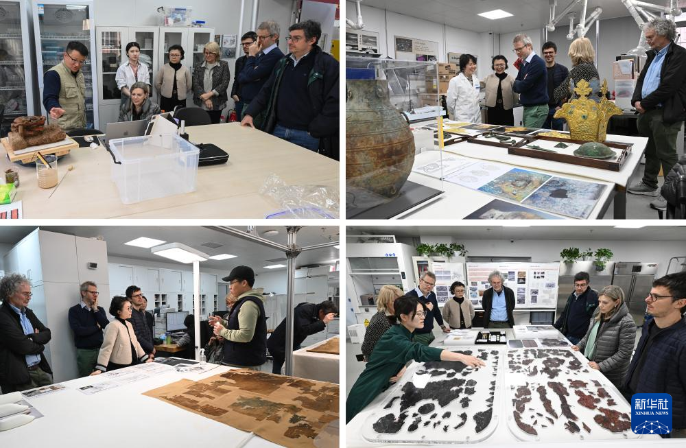 4月2日,参加中意文化遗产保护修复国际圆桌会议的意方专家在中国社会科学院科技考古与文化遗产保护重点实验室参观了解科技考古与文物保护情况。这是专家们在多个子实验室参观(拼版照片)。