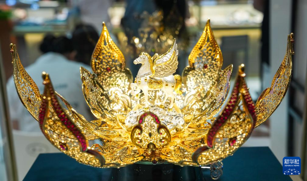 这是4月15日在第六届消博会上拍摄的老凤祥展出的鎏金骐翼·莲鸣八音盒。