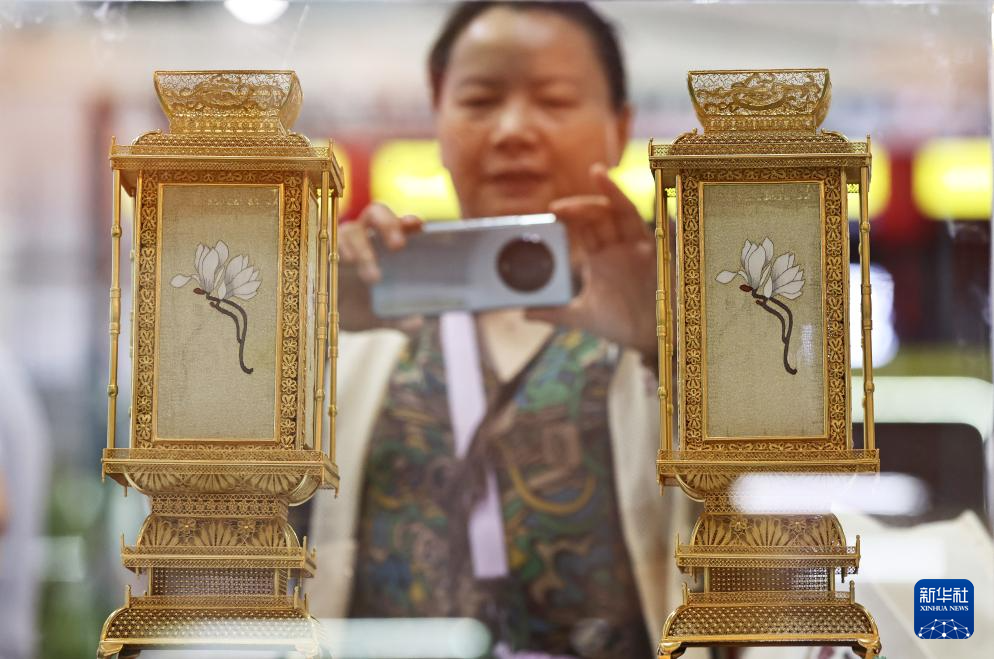 4月15日,参观者在第六届消博会拍摄一款花丝镶嵌缂丝宫灯。