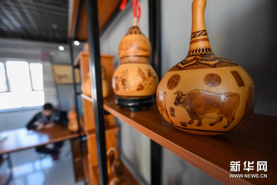 在加尔苏村的烙画工作室,曹光耀在创作葫芦烙画(2月6日摄)。新华社记者 丁磊 摄