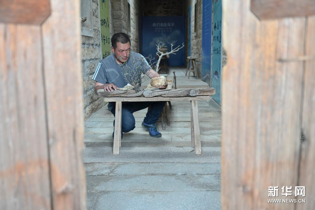 4月19日,蔡竞翔在被改造为海漂艺术品陈列馆的老宅里用船木、贝壳和珊瑚骨进行创作。新华社记者 宋为伟 摄