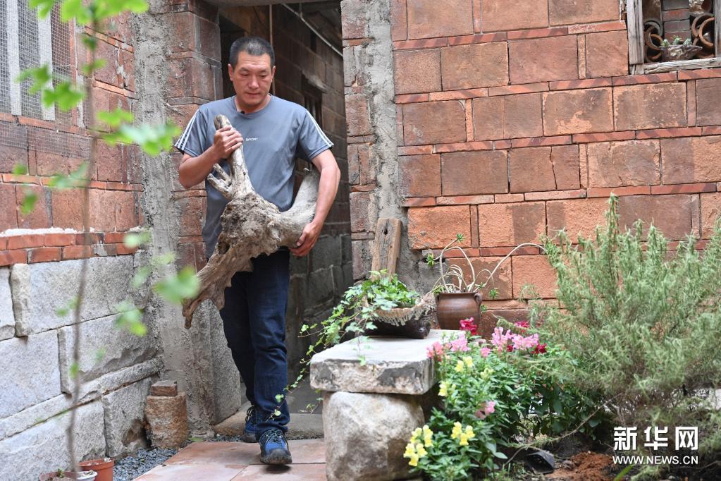 4月19日,蔡竞翔在被改造为海漂艺术品陈列馆的老宅里搬运一块海滩捡来的树根。新华社记者 宋为伟 摄