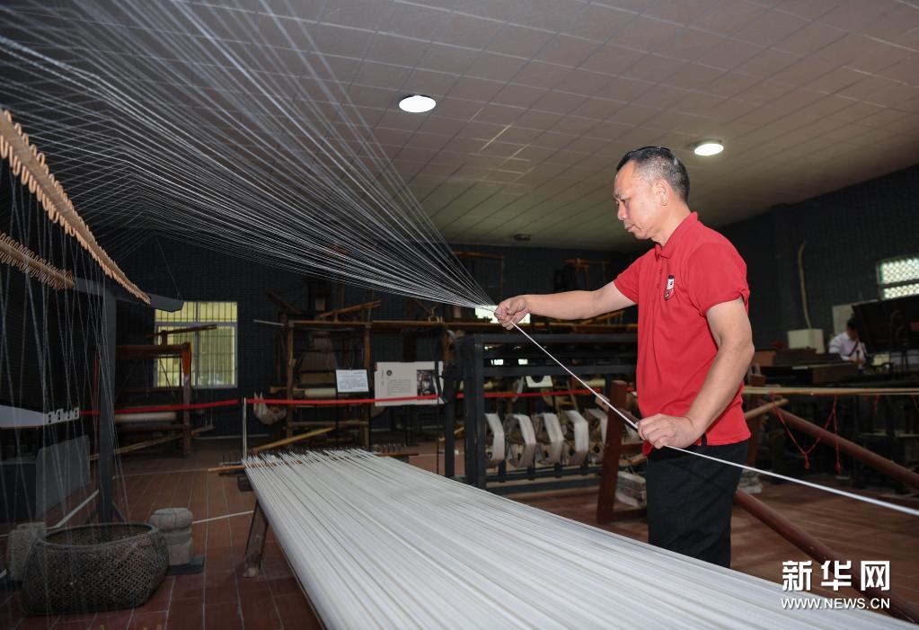 在广东省佛山市西樵香云纱丝绸博物馆,香云纱织造技艺佛山市级代表性传承人张绍景展示传统工艺流程(4月23日摄)。新华社记者 邓华 摄