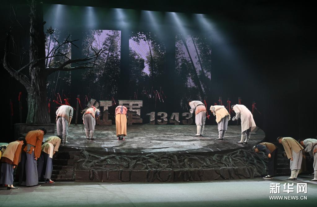 7月3日,在福建人民艺术剧院,演员在剧末向无名红军墓背景鞠躬。新华社记者 宋为伟 摄